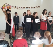 Jedną z akcji było przygotowanie wspólnie z naszymi koleżankami i kolegami ze Szkoły Podstawowej w Brzozowie, którzy należą do Szkolnego Koła Wolontariatu, inscenizacji pt. „Wdzięczni za niepodległość” dla uczniów z klasy „0”.