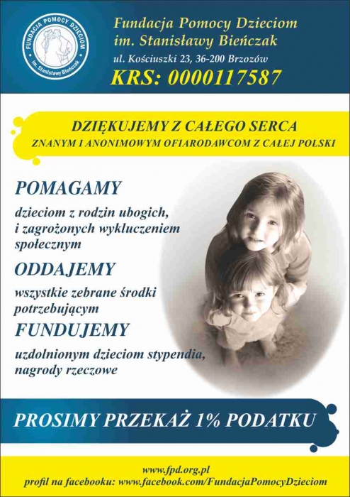 W zamian za przekazanie 1% podatku dochodowego za rok 2014 na rzecz Fundacji Pomocy Dzieciom im. Stanisławy Bieńczak rozliczymy Twój PIT.