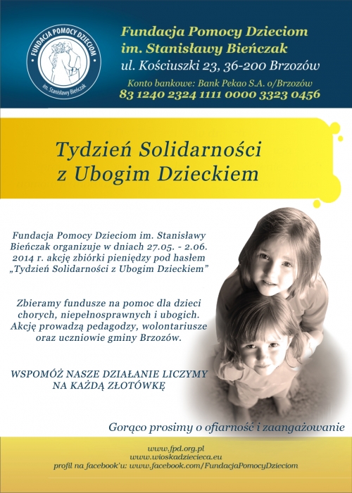 Dziś rozpoczął się Tydzień Solidarności z Ubogim Dzieckiem i potrwa do 1 czerwca. W tym roku do akcji włączyły się szkoły: Szkoła Podstawowa w Brzozowie, Gimnazjum nr 1 w Brzozowie, Zespół Szkół Ekonomicznych w Brzozowie, I Liceum Ogólnokształcące w Brzozowie, Zespół Szkół Budowlanych w Brzozowie, Zespół Szkół nr 1 w Przysietnicy, Zespół Szkół nr 2 w Przysietnicy, Zespół Szkół w Starej Wsi, Zespół Szkół w Górkach, Zespół Szkół nr 1 w Humniskach, Zespół Szkół nr 2 w Humniskach, Zespół Szkół w Turzym Polu, Zespół Szkół w Grabownicy Starzeńskiej.