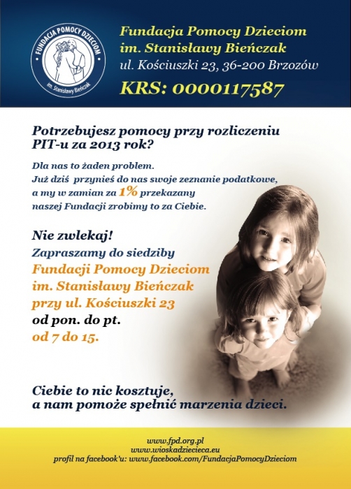 Chcesz mieć problem z głowy? Jak najszybciej rozlicz swój PIT, Ciebie to nic nie będzie kosztowało, a my przekażemy Twój 1% na pomoc najbardziej cierpiącym dzieciom. Zapraszamy do siedziby Fundacji od poniedziałku do piątku w godzinach od 7.00 do 15.00. Cierpiące dzieci czekają na Twoją pomoc!