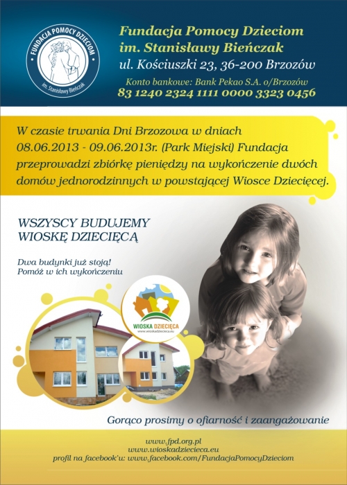 Uprzejmie informujemy, że w dniach 8.06.-09.06.2013 w trakcie Dni Brzozowa w Parku Jordanowskim będziemy prowadzić zbiórkę pieniędzy na wykończenie i wyposażenie dwóch wybudowanych domów w powstającej Wiosce Dziecięcej. Zachęcamy do włączenia się w tę zbiórkę.